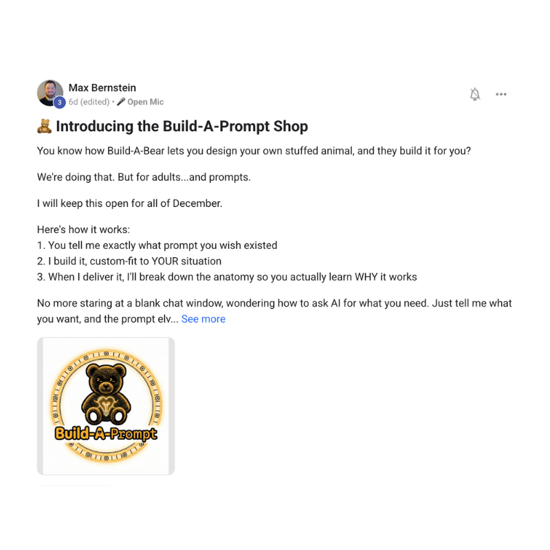 "How do I use Ai for [specific thing]?" β Answered in hours. We welcome all levels of experience inside the community, there's something here for every human. We're all here to support each other: it's ok to brag about your Ai wins, learnings, and workflows!