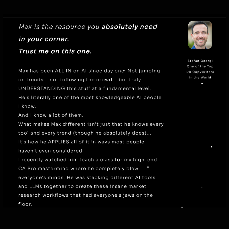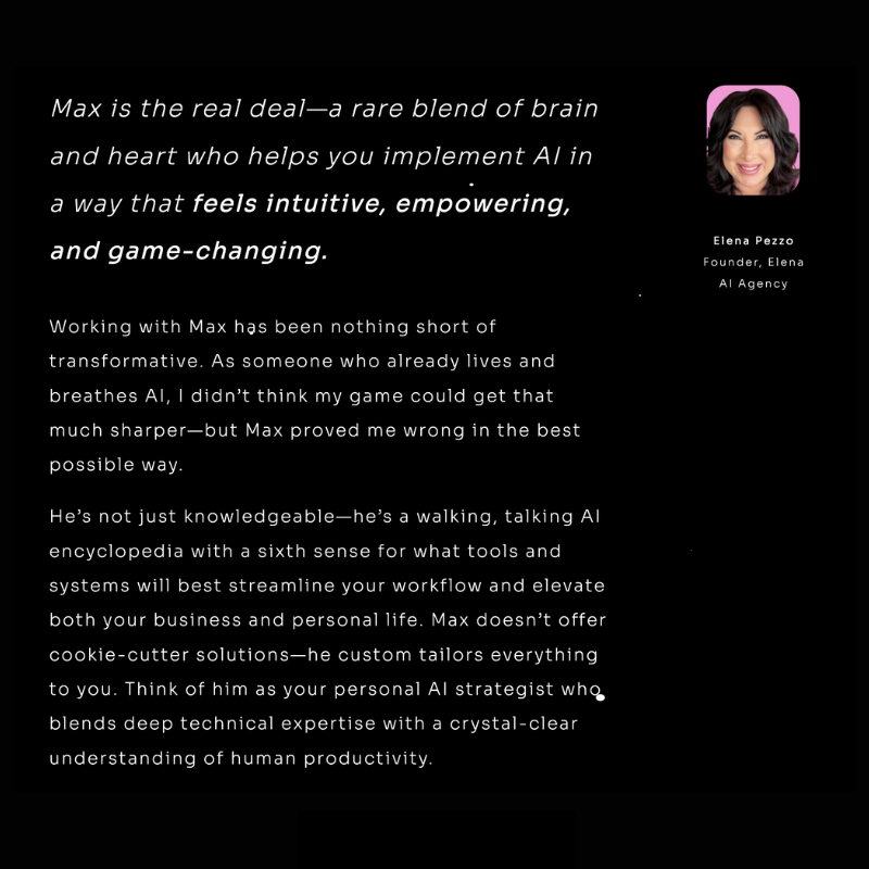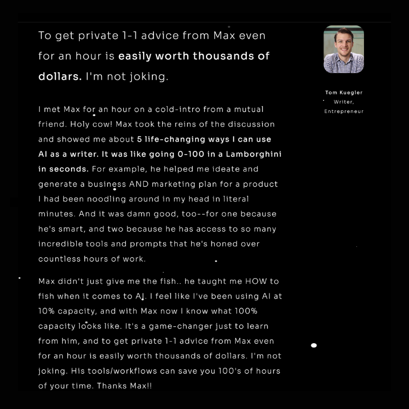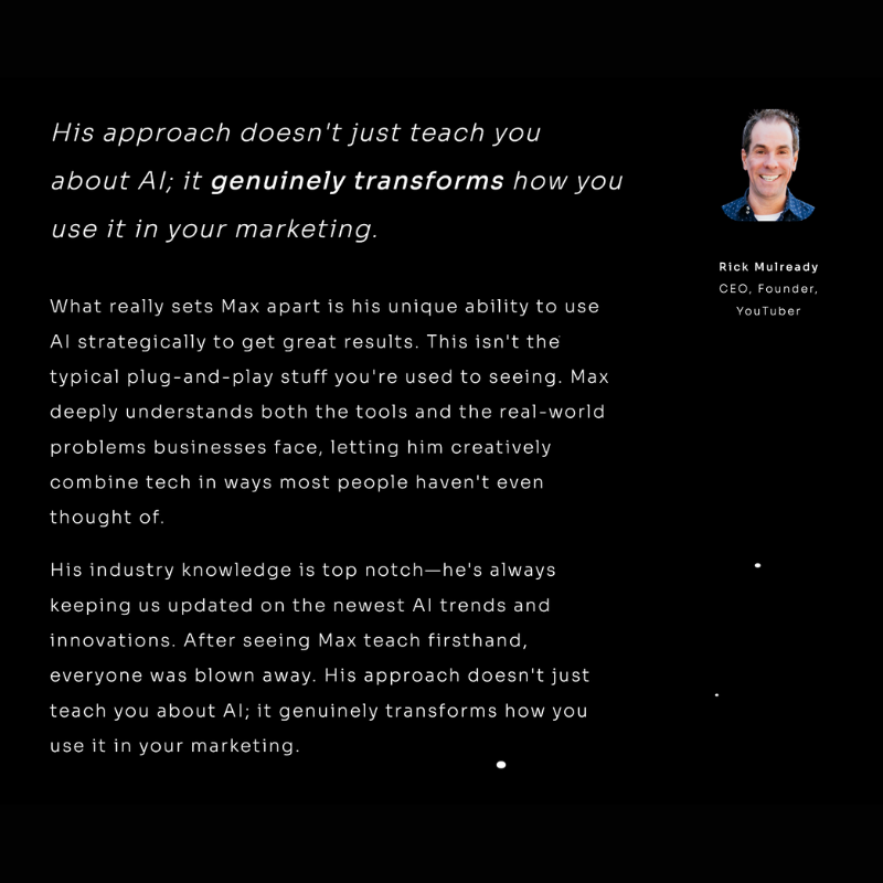 He's got a long list of workshops, clients, and colleagues. Currently working with 9 figure sales mentor, Jay Abraham, to improve Jay's newsletter. Michael Hyatt recently brought Max in for his expertise in AI strategy. With over 50+ client engagements in the last 2 years, he's in the trenches practicing what he teaches.
